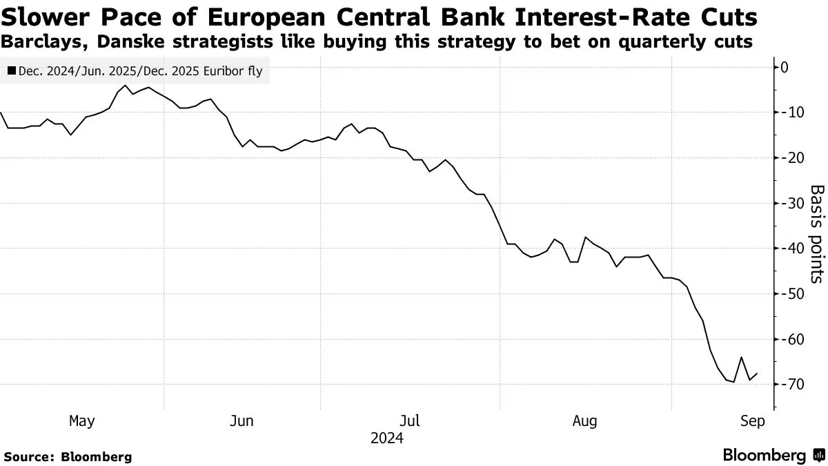 欧洲央行降息的速度可能比市场预期的要慢,根据巴克莱和丹斯克银行的策略师的说法。预计将进行季度降息,而不是从12月到6月每次会议都降息,两个贷款机构表示。欧洲央行管理委员会成员彼得·卡齐米尔昨天表示,该银行可能只能在今年最后一次会议上再次降息。