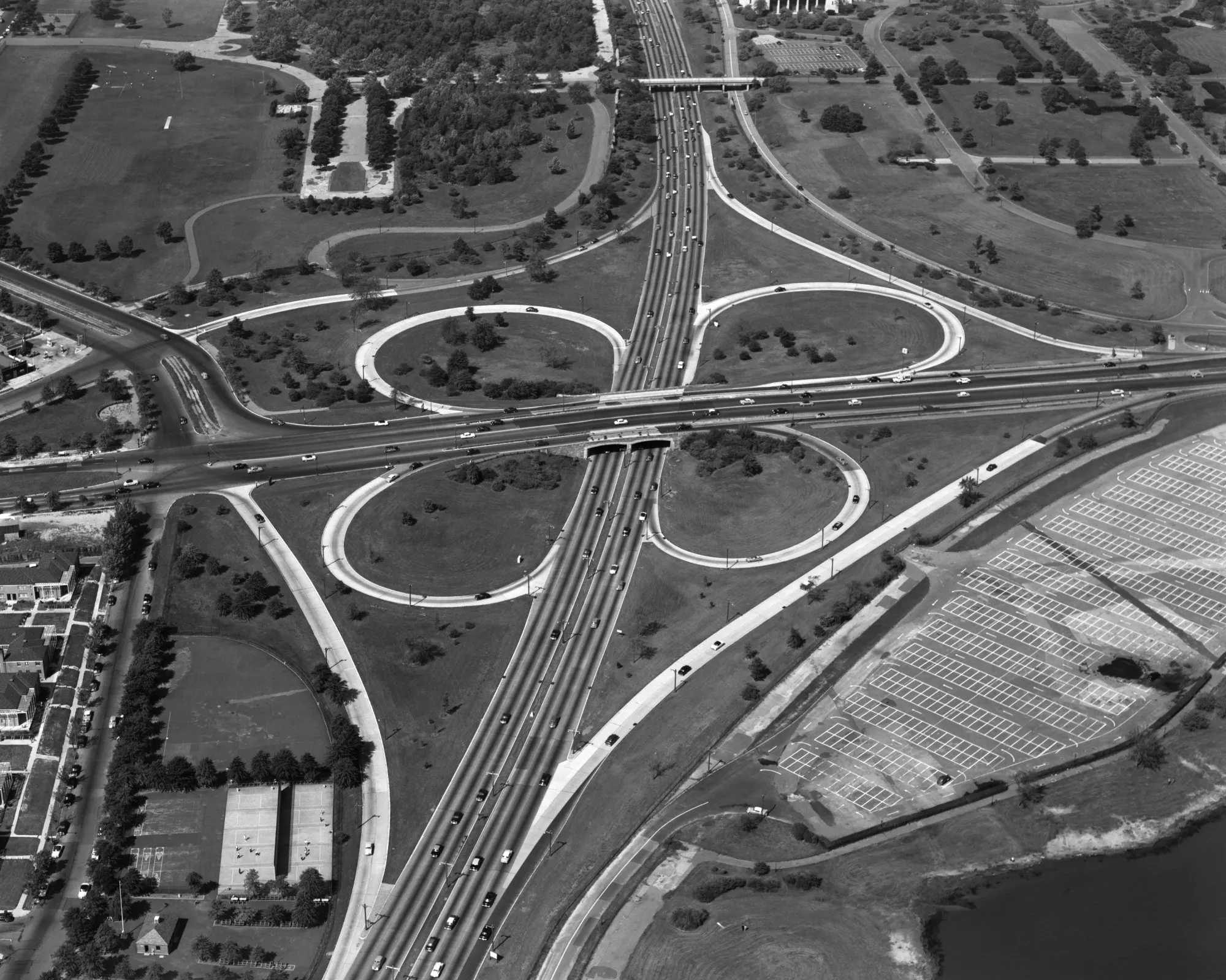 战后美国土地使用的典型例子:1959年纽约的高速公路立交与地面停车场相邻。摄影师:R. Krubner/ClassicStock/Getty Images 你写到以往的规划和设计如何造成了郊区扩张和隔离,并推动了你所呼吁的相反方向。