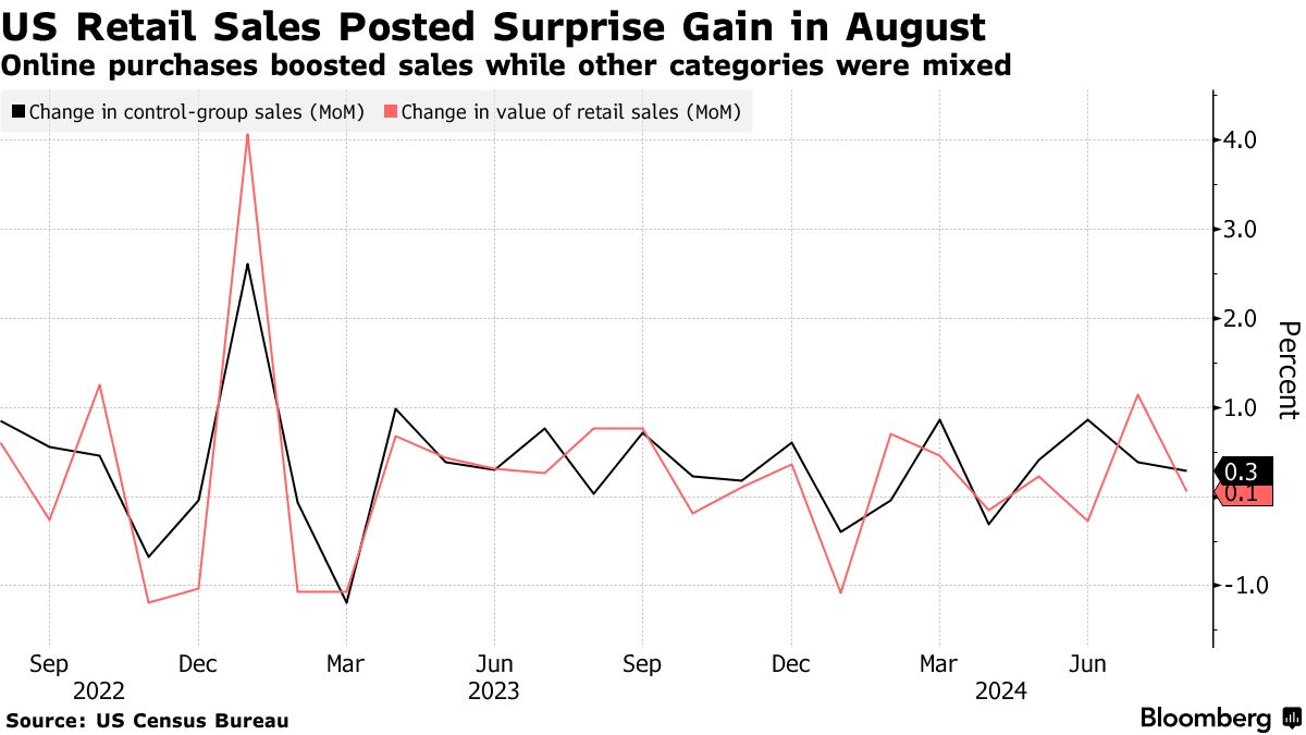 美国零售销售在八月份意外上升,得益于在线购物掩盖了其他商家的更为复杂的结果。