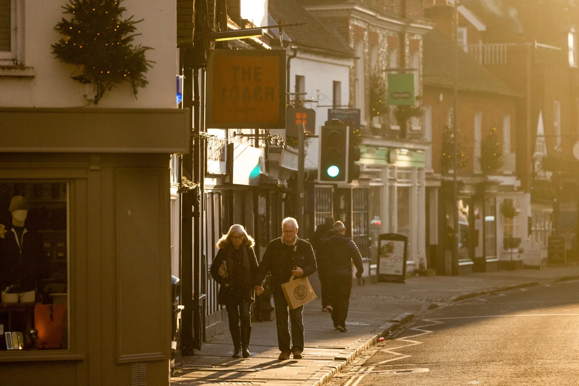 购物者在2022年12月6日走在英国马尔洛的主要街道上。