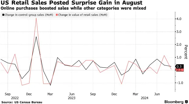 美国零售销售 在八月份意外上升,暗示 家庭需求的韧性 在第三季度中期,即使招聘和工资增长显示出放缓的迹象。