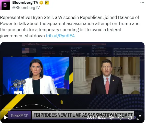 今天在彭博电视的 权力平衡 早间版中,主持人乔·马修和凯莉·莱因茨采访了威斯康星州共和党代表布莱恩·斯泰尔,讨论了对特朗普的明显刺杀企图以及通过临时拨款法案以避免联邦政府停摆的前景。