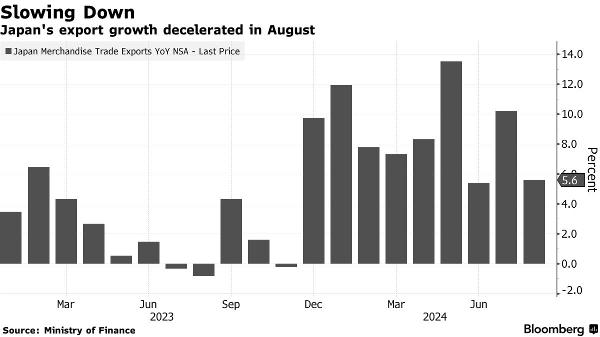 根据财政部周三的报告,8月份出口同比增长5.6%,较上个月的10.2%有所减速。这个结果未能达到经济学家预期的10.6%。汽车出口下降了9.9%,建筑和矿业机械的出货量也大幅下滑。