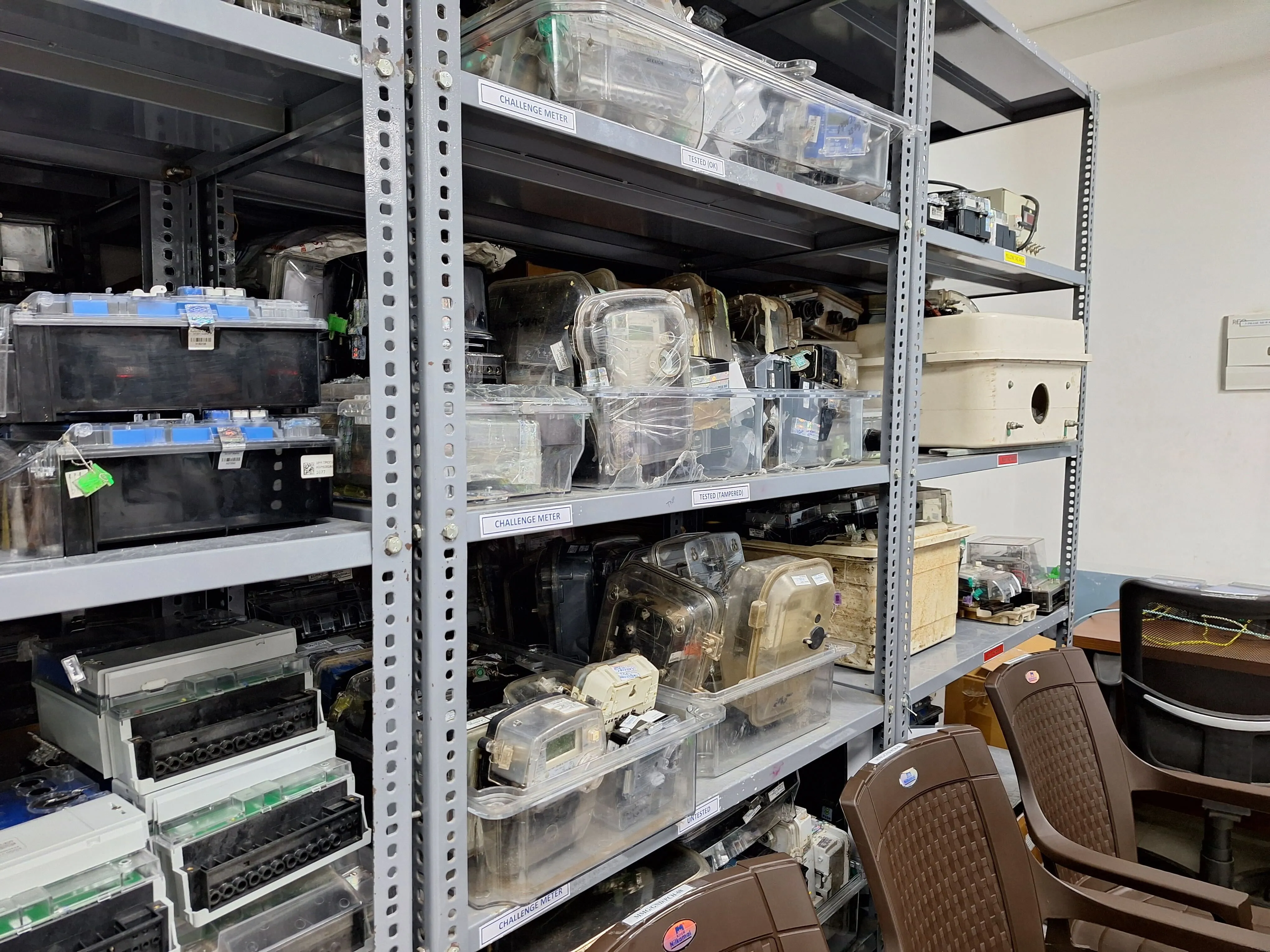在布巴内斯瓦尔的塔塔电力计量测试实验室堆放的故障或篡改的电表。摄影师:拉杰什·库马尔·辛格/彭博社马利克和其他基层工作人员,身穿显眼的蓝色纱丽,携带便携式账单打印机,展示了现场发生的巨大变化。