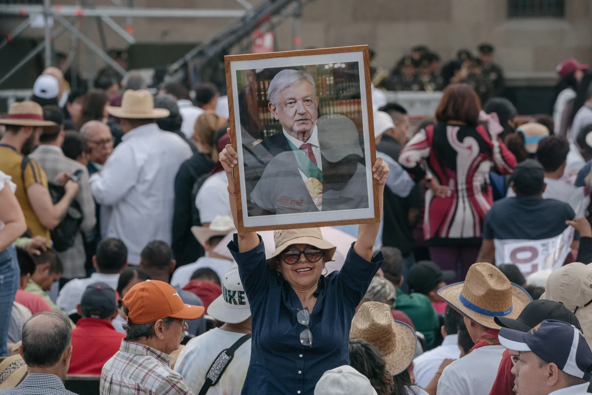 一位支持者在9月1日的最后一次国情咨文前,手持安德烈斯·曼努埃尔·洛佩斯·奥夫拉多尔的画像。