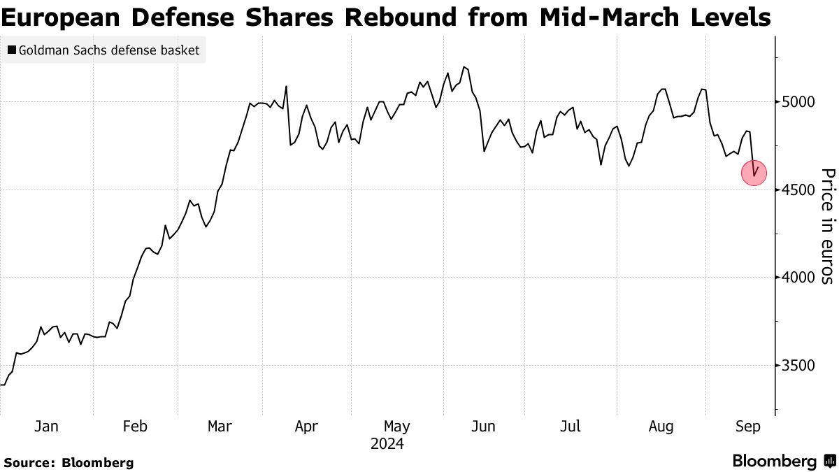 该公司覆盖的股票在周二的市场价值下降了64亿欧元。他们写道,自2022年2月乌克兰战争开始以来,高盛集团的一篮子欧洲防务股票几乎增长了三倍,而Stoxx欧洲600指数的回报率为25%。
