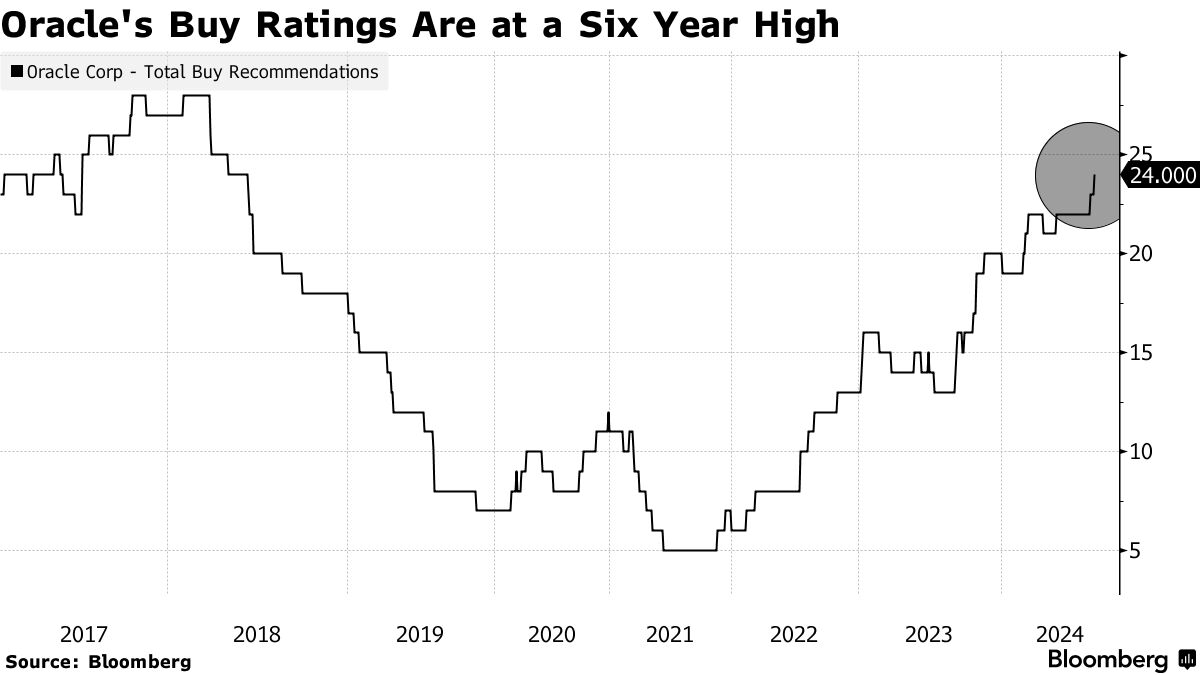 这家软件巨头的股票今年上涨了近60%,其中一部分涨幅是在上个月的超出预期的收益和销售预测预计在未来五年内大致翻倍后获得的。根据彭博社汇编的数据,最近两次分析师的升级使华尔街对甲骨文的看法达到六年来最乐观的状态,24家公司将甲骨文的股票评级为买入。