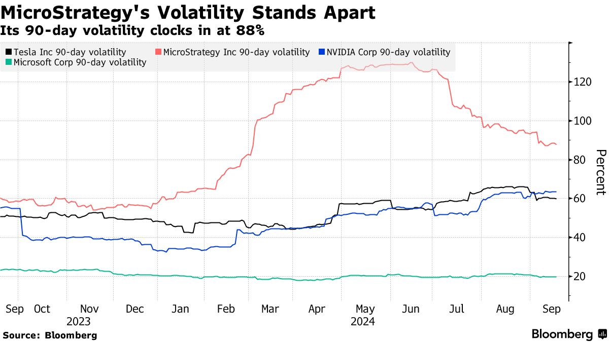 由于持有数字代币,MicroStrategy被视为比特币的代理。其90天波动率约为88%,突显出MSTU持有者面临的剧烈波动。相比之下,Nvidia Corp.的90天波动率为63%,微软公司的波动率为20%。与此同时,MSTX ETF在有限的交易时间内,20天波动率约为150%,彭博数据显示。