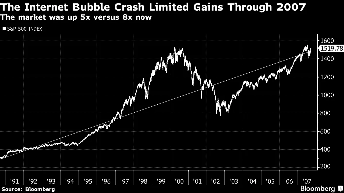 相比之下,在2007年金融危机开始之前的同一时间段内,股票已经经历了一场过山车,反映了互联网的繁荣与崩溃,当时股票偏离了长期趋势线。结果:股票上涨了五倍——仍然强劲,但可以说是一个更好的基础来建立收益。