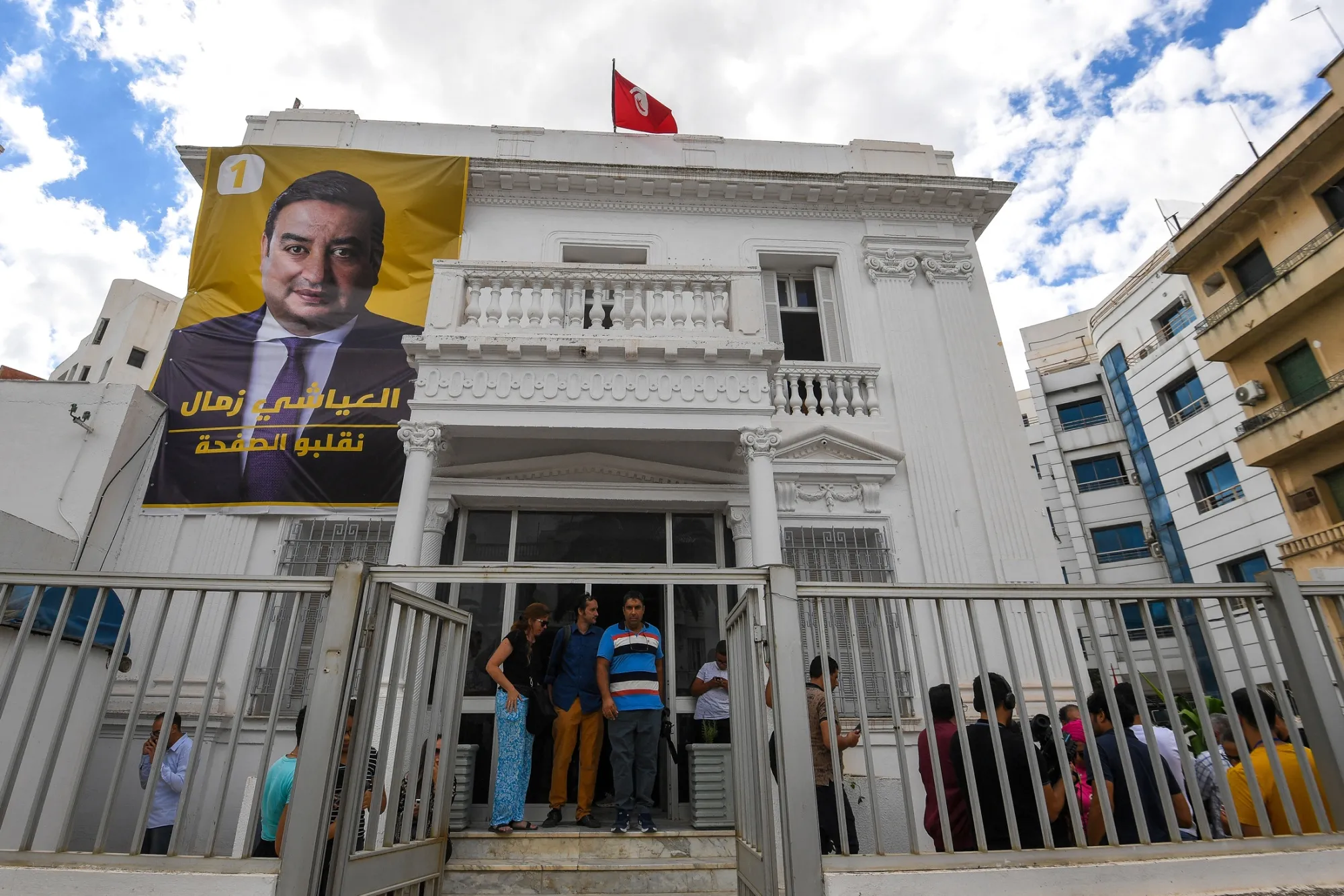 9月16日,阿亚奇·扎梅尔在突尼斯的选举总部的海报。摄影师:费提·贝莱德/法新社/盖蒂图片社突尼斯总统凯斯·赛义德在10月选举中的两位对手之一被判处20个月监禁,他的竞选团队表示这是为了排挤挑战者,而这次投票已经因大规模逮捕批评者而受到影响。