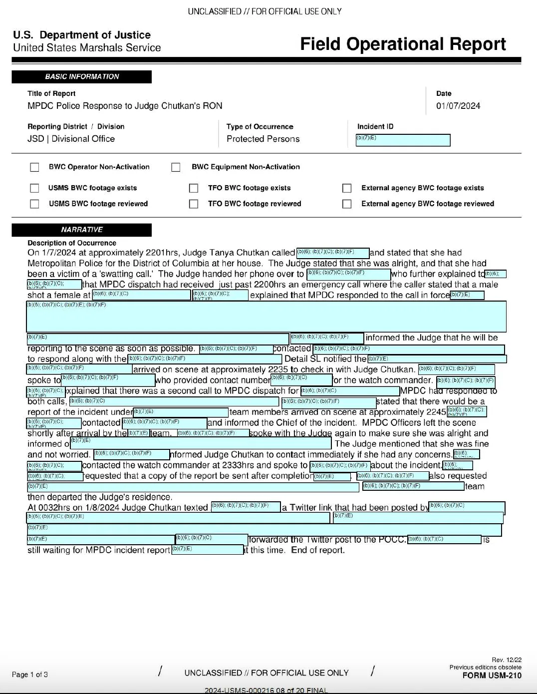 当时这一事件被广泛报道。新闻报道几乎完全基于警方报告。但没有来自负责保护联邦法官的美国法警局的任何信息。我在一月份提交了信息自由法案请求以了解更多信息。我还在几个月前向美国法警局提交了一份请求,获取关于2022年和2023年针对所有保护对象的威胁的数据。我刚刚收到了文件,这两份请求的文件中包含一些揭示性的新细节。