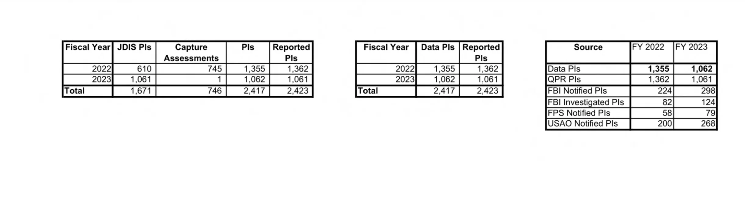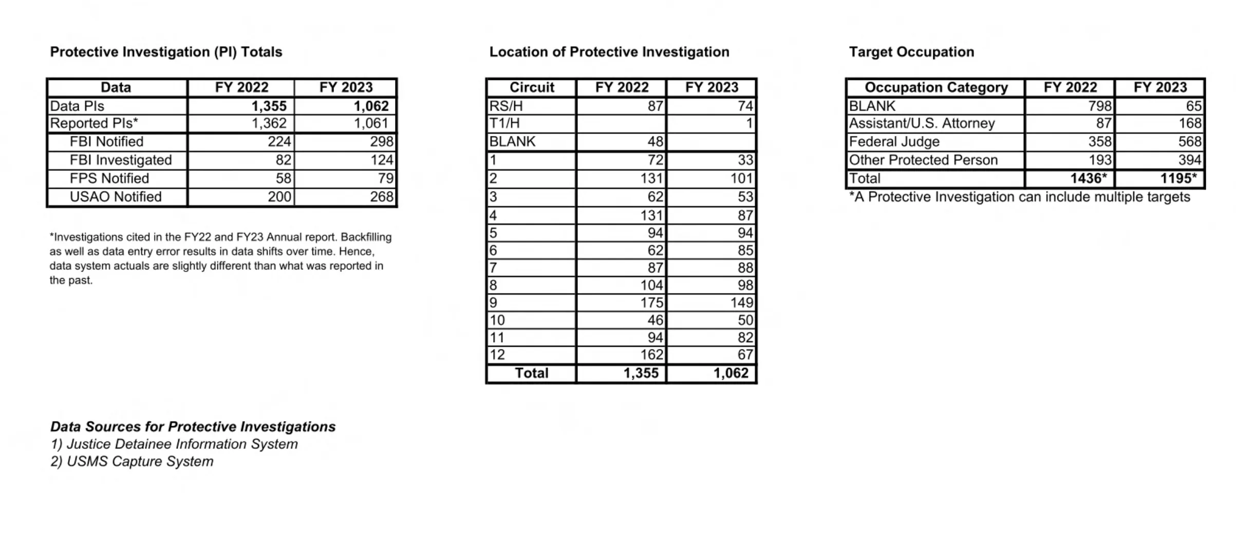总体而言,2023年所有法警局保护对象的威胁数量从2022年的1,362下降至1,061。数据显示,FBI被通知的与威胁相关的案件数量在2023年增加至298起,而2022年为224起。然而,FBI对这些威胁展开的实际调查数量要低得多。2023年为124起,而前一年为82起。