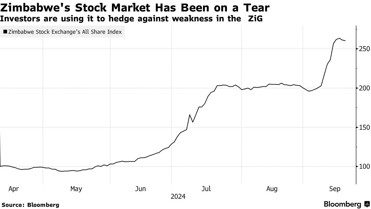 南部非洲国家推出了ZiG,这是15年来第六次尝试推出有效货币,以在其前身津巴布韦元今年对美元贬值超过80%后重建对本地货币的信心。其暴跌导致投资者涌入股票市场作为避风港,并对飙升的通货膨胀进行对冲,导致股市上涨超过四倍。