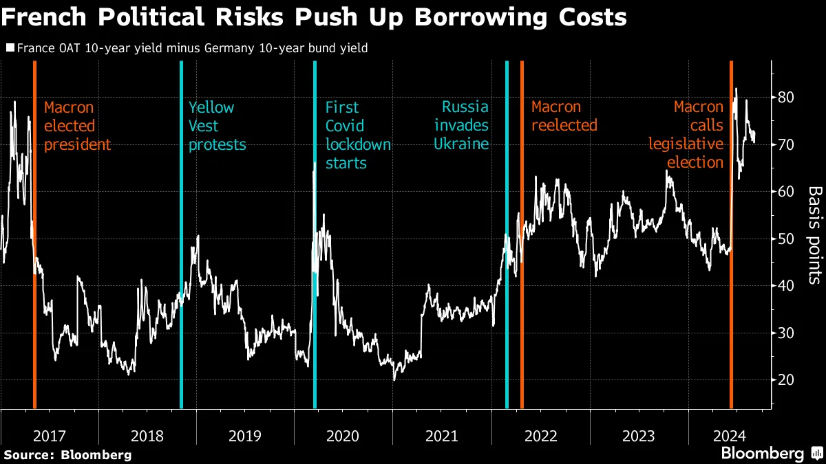 所有这些意味着法国真正需要的结构性变化的可能性很低,报道称政府支出将“冻结”,预计将节省约100亿欧元。彭博经济学估计,法国的主权债务在2031年至2036年之间按照欧洲财政规则减少的几率低至11%。尽管如此,正如巴尼尔可能会说的,这显然将是一段漫长的旅程——而目前的民调显示他得到了公众的支持。与布鲁塞尔之间也必须进行一些 妥协,这不会想让事情变得更糟。