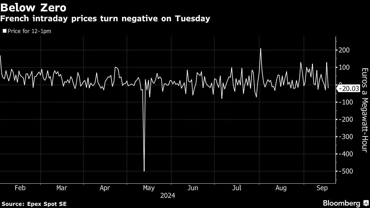 法国电力价格在周二转为负值,持续 几个小时,因低需求与风能发电增加和强劲的太阳能输出相结合。