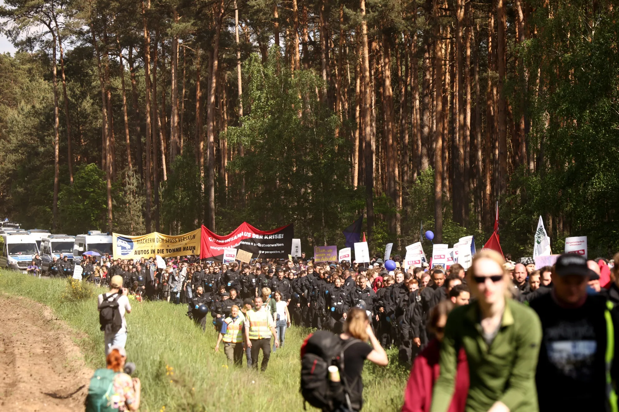 抗议者在德国格伦海德的特斯拉工厂扩建示威中与警方并肩行进,时间是5月11日。