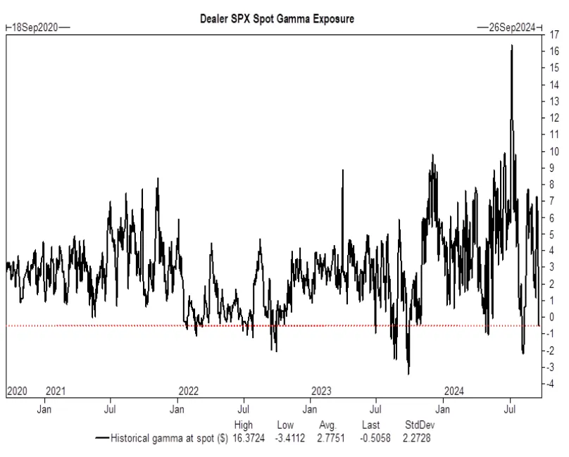 在第三季度结束前还有七个交易日,风险包括周五的期权到期和标普500指数的伽马——期权波动性的一个衡量指标——转为负值。过去两天,长期伽马头寸下降了大约61亿美元,这是自2019年以来摩根士丹利数据集中第三大降幅。综合来看,这意味着华尔街的交易商不会在这个下跌中买入以维持市场中性头寸。