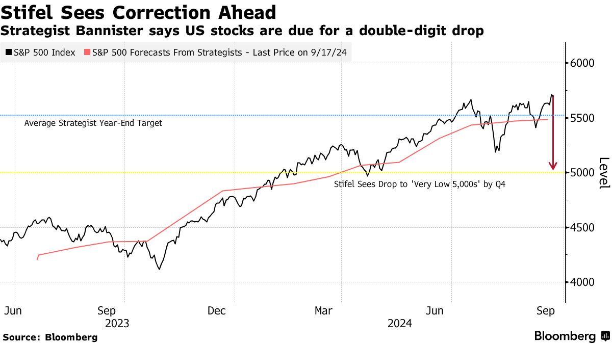 这位预测者是少数几位在2023年上半年正确预测股市反弹的策略师之一,而他的许多同行则发出了衰退警告。但随后班尼斯特转向看跌,首先预测标准普尔500指数将持平,现在则预测大幅下跌——这些观点迄今未能实现。在夏季之前,他在预测修正方面是正确的,8月份的波动期间,美国股市指标从高点到低点下跌了多达8.5%,尽管该指数现已回到历史最高水平交易。