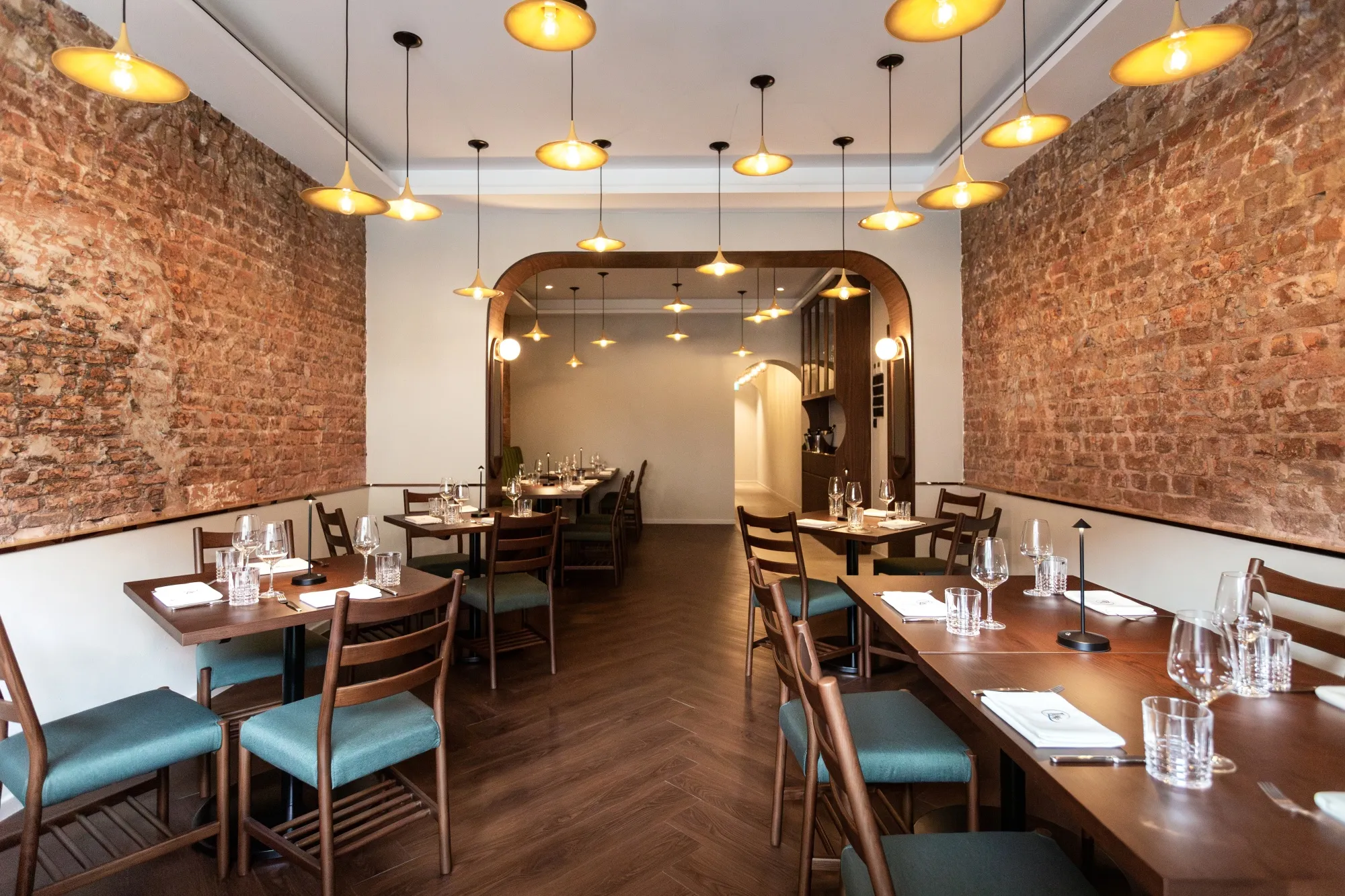 **氛围。**餐厅以意大利语“旅馆”命名,餐厅简单而质朴,裸露的砖墙和木地板下悬挂着一串碟形灯泡。
