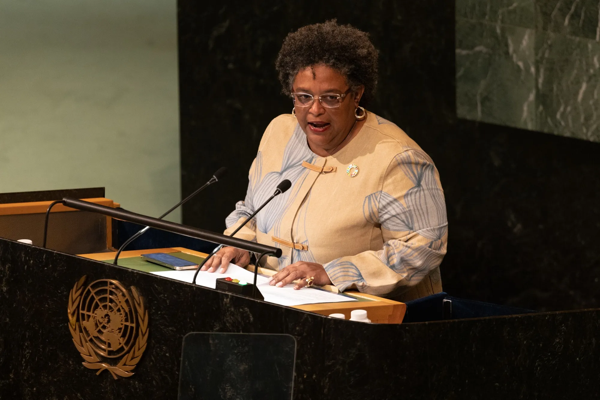 米娅·莫特利,巴巴多斯总理,于2022年9月22日在纽约联合国大会上发言。摄影师:吉娜·穆恩/彭博社莫特利将出席各种气候周活动,成为世界领导人和外交官中的一员。其他重要人物如 前美国气候特使约翰·克里 和欧洲委员会主席 乌尔苏拉·冯·德莱恩 也将参与其中。