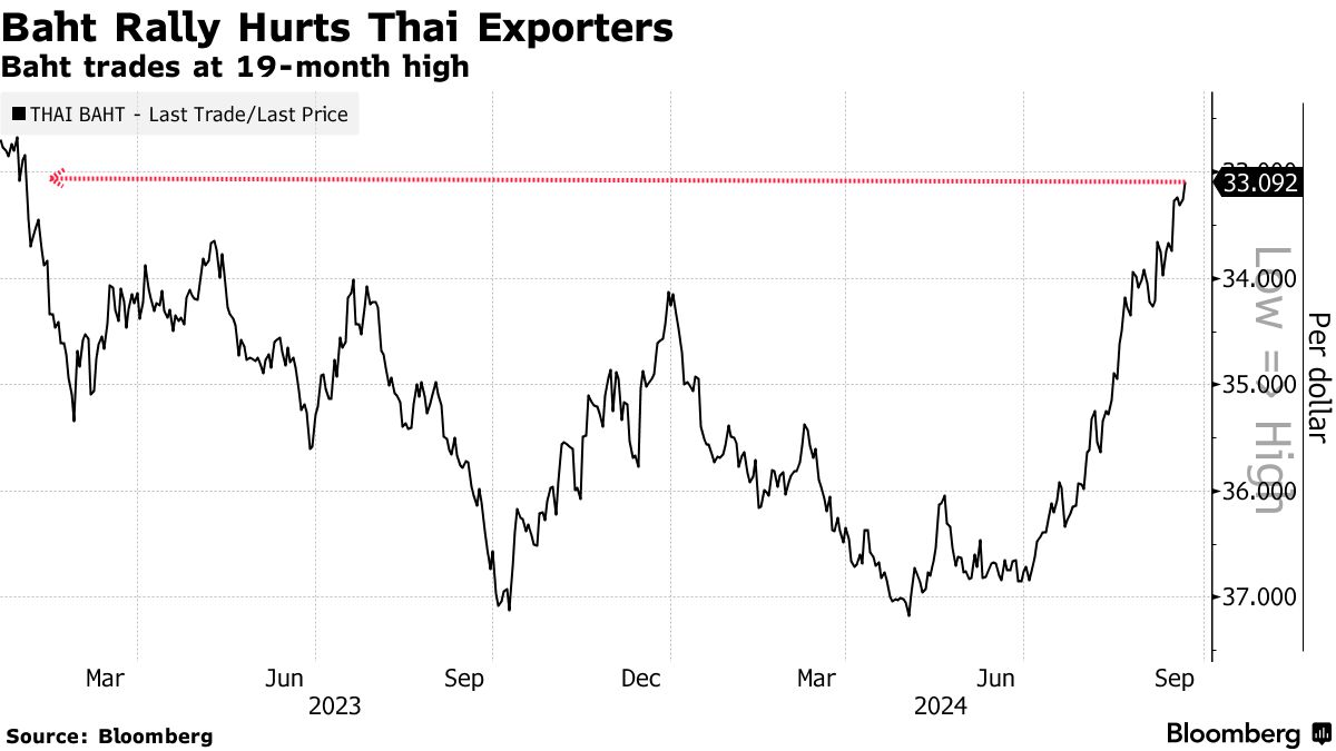 自6月底以来,随着美元因预期美国联邦储备委员会降息而走弱,泰铢上涨了约11%,外国资金涌入东南亚国家的债券和股票。这促使人们呼吁中央银行进行干预,并降低利率以保护出口和旅游业——这两个是泰国5000亿美元经济的支柱。