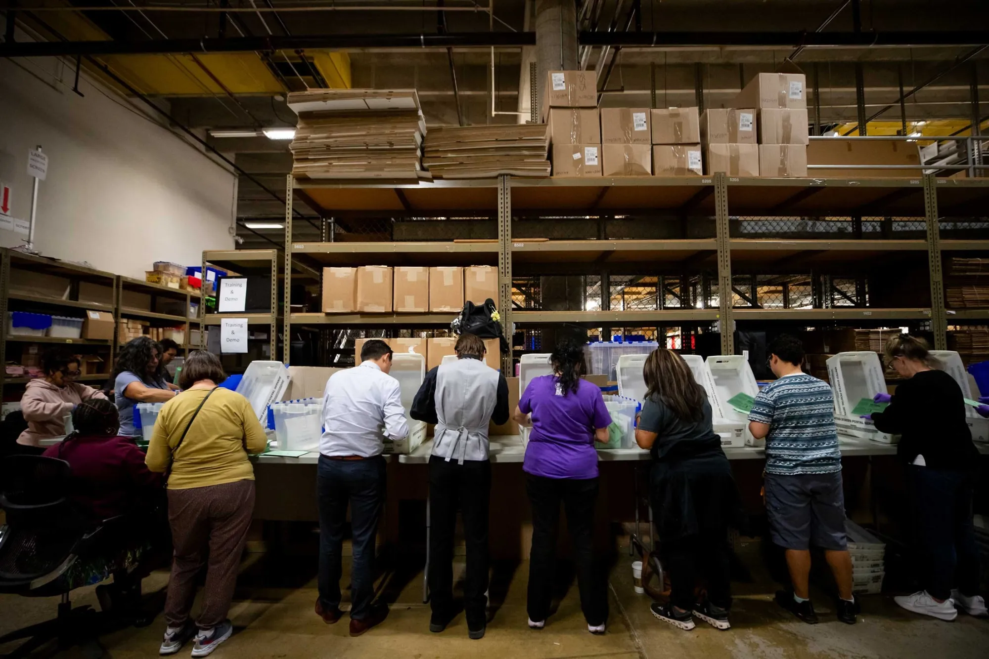 工人在2024年3月19日的凤凰城马里科帕县计票与选举中心内整理选票。