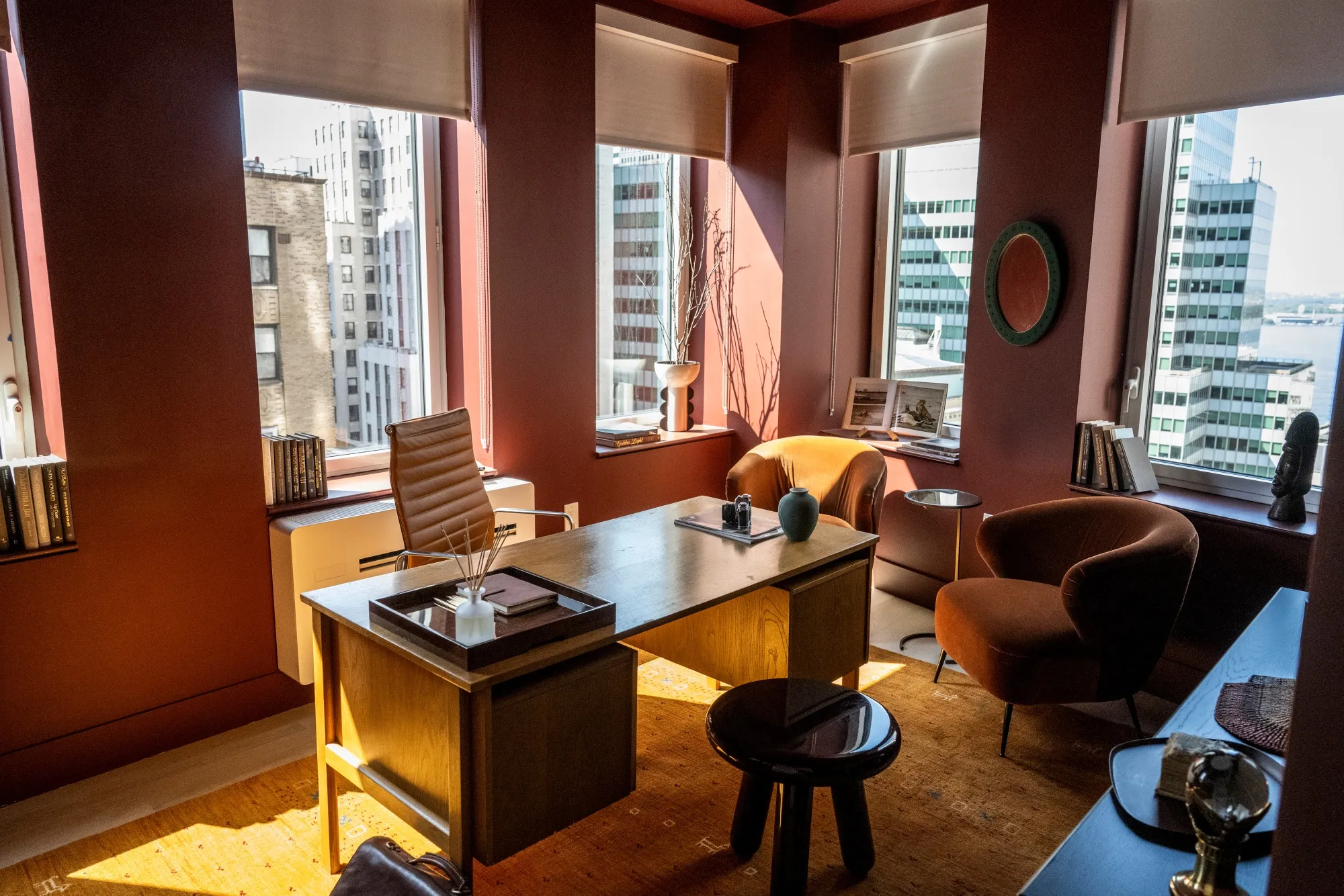 位于纽约市金融区新装修的55 Broad St.的一个角落家庭办公室。Cetra希望在附近进行另外两个改建项目:AIG位于80 Pine St.的前办公室和61 Broadway的一座塔楼。布鲁克林开发商Bushburg Properties今年购买了80 Pine,并正在提交超过1000个单元改建的初步申请。RXR 在2022年底未能偿还其在61 Broadway的2.4亿美元贷款,目前正在改建过程中。