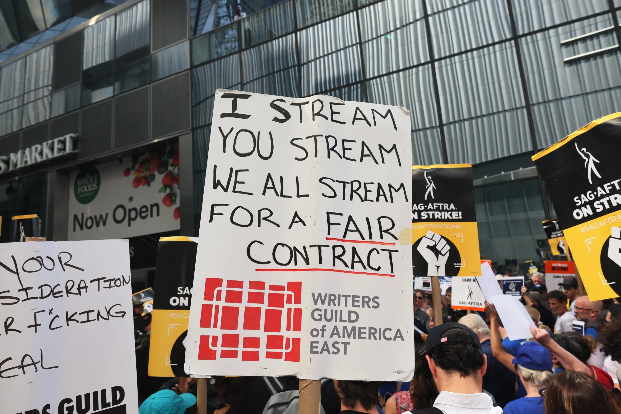 人们在2023年8月纽约SAG-AFTRA和美国东部编剧协会的罢工期间举着标语。摄影师:迈克尔·M·圣地亚哥/盖蒂图片社华特迪士尼公司和赫斯特通讯公司的A+E事实工作室的工人们正在尝试组建工会,旨在在大部分未被代表的非虚构电视行业中建立一个高调的立足点。