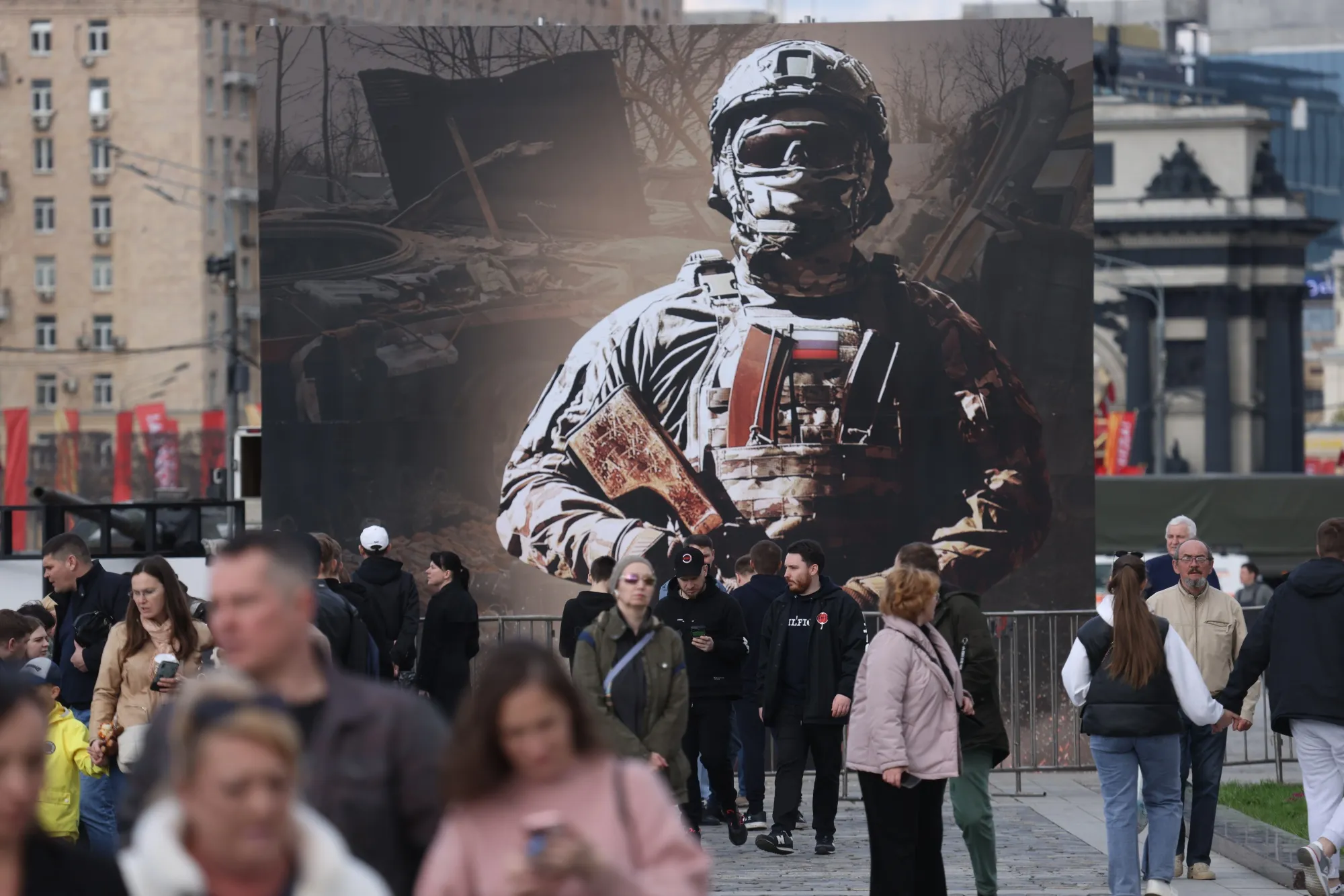 人们在莫斯科的一个俄罗斯士兵广告牌前走过。