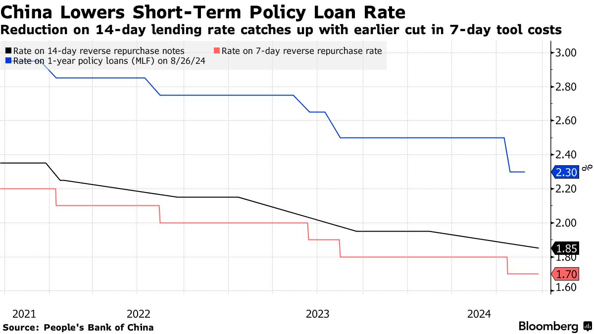 在亚洲,关于北京将加大复苏增长努力的猜测激增。当局周一宣布,中央银行行长潘功胜将在周二举行关于经济发展金融支持的新闻发布会。几分钟后,中国人民银行降低了14天逆回购利率,跟上了七月份开始的降息步伐。
