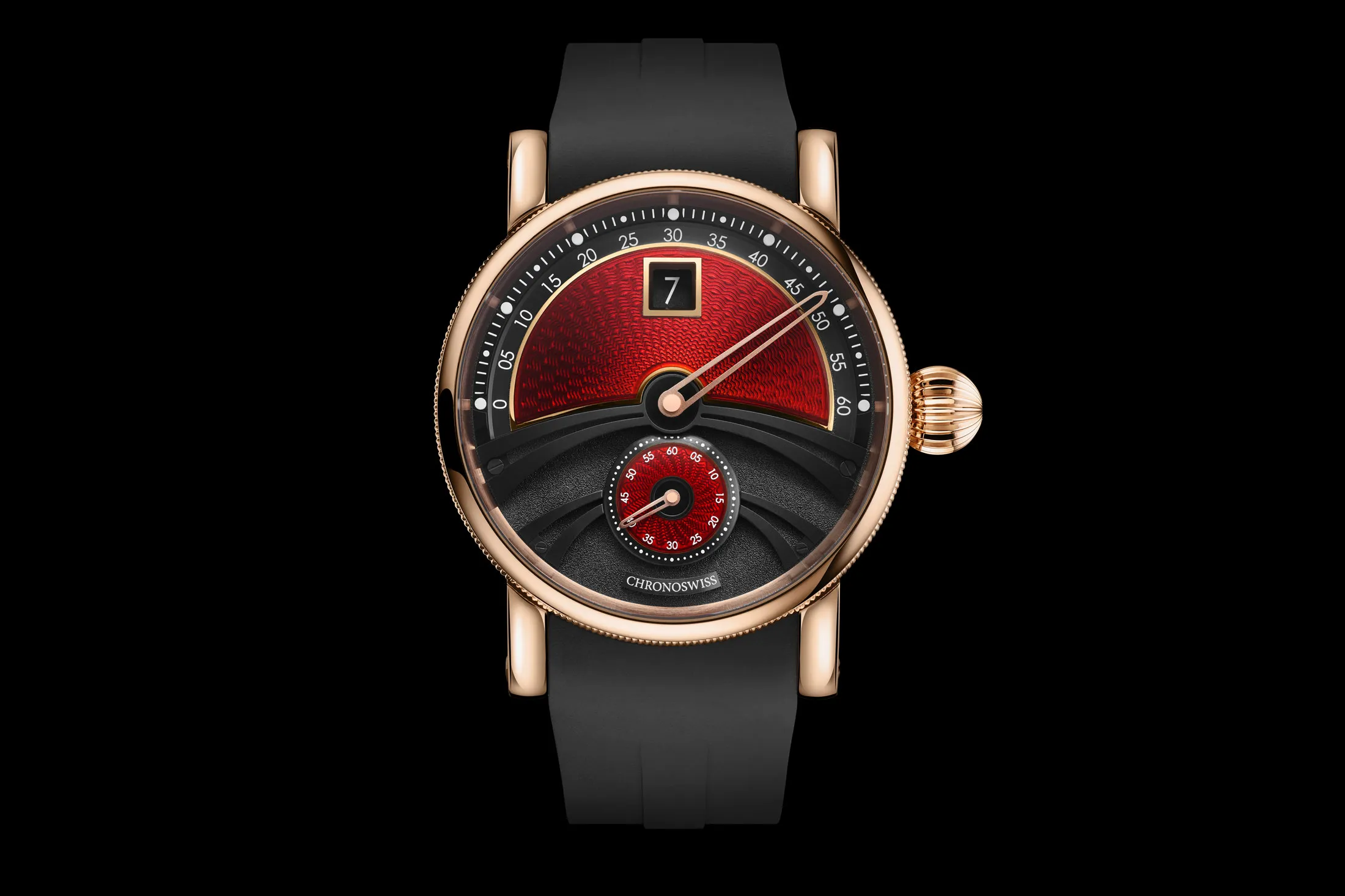 如果你更喜欢适合万圣节的东西, 德尔菲斯德古拉($41,800)于六月发布,提供三种不同的时间显示模式:除了跳时窗口和小秒针副表盘外,逆行分钟指针在表盘顶部扫过。(在80年代末,Chronoswiss是调节器手表的先驱,将分钟、小时和秒分开操作。)