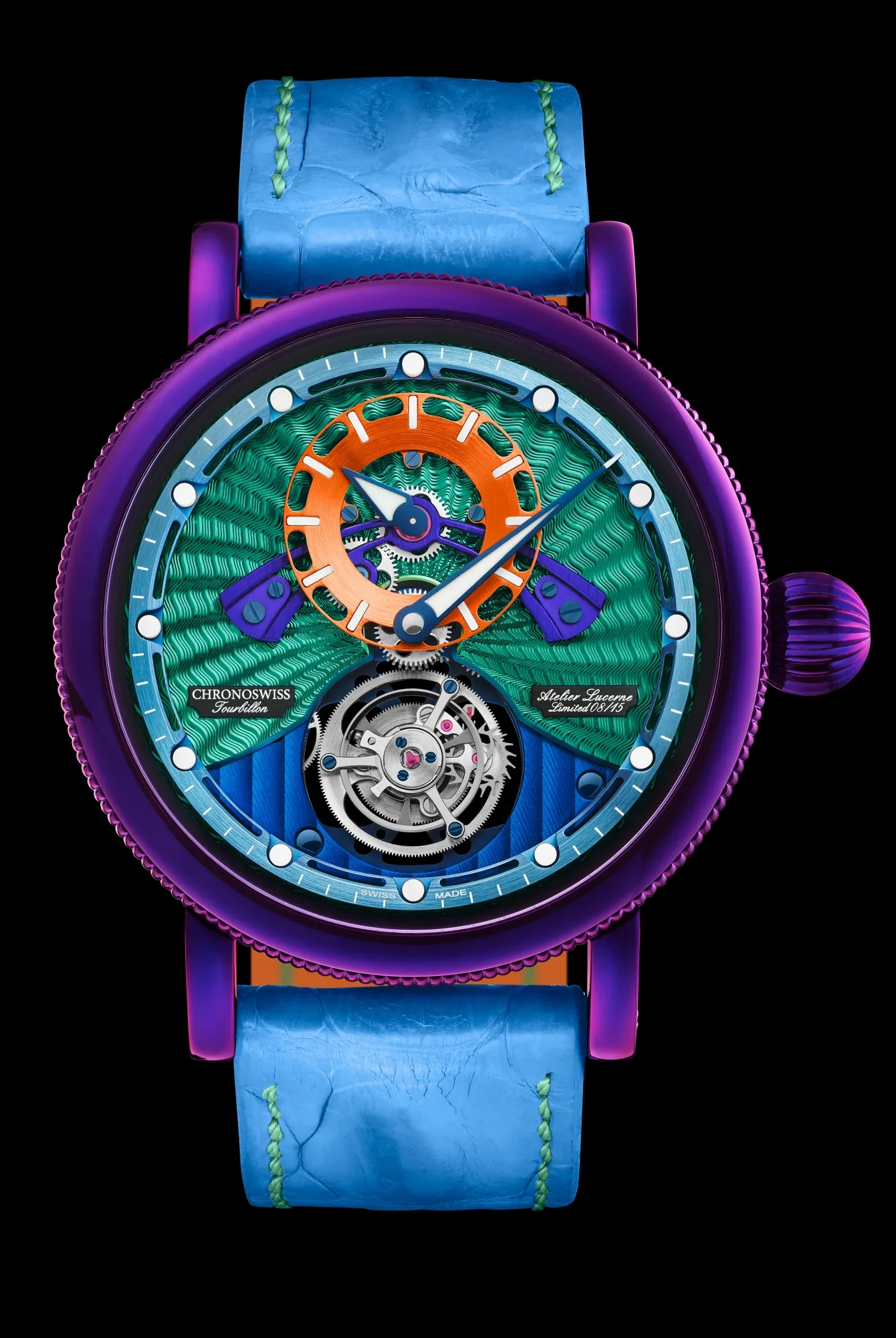 Chronoswiss 开放齿轮飞行陀飞轮心理。来源:Chronoswiss一个例子是新的 开放齿轮飞行陀飞轮心理($48,600),限量15件。令人眩晕的雕纹表盘在明亮的绿色和蓝色中波动,鲜艳的橙色时针环位于陀飞轮上方。不锈钢表壳和球状洋葱表冠,作为Chronoswiss的商标,采用一种称为化学气相沉积的方法来实现深紫色涂层。