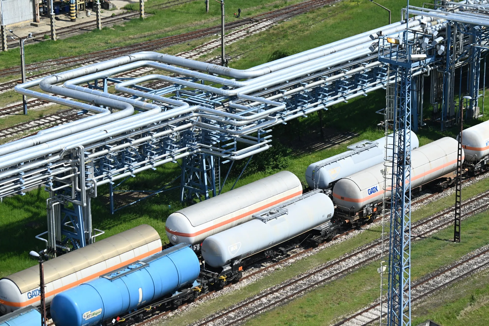 匈牙利德鲁日巴管道沿线的汽油铁路集装箱。