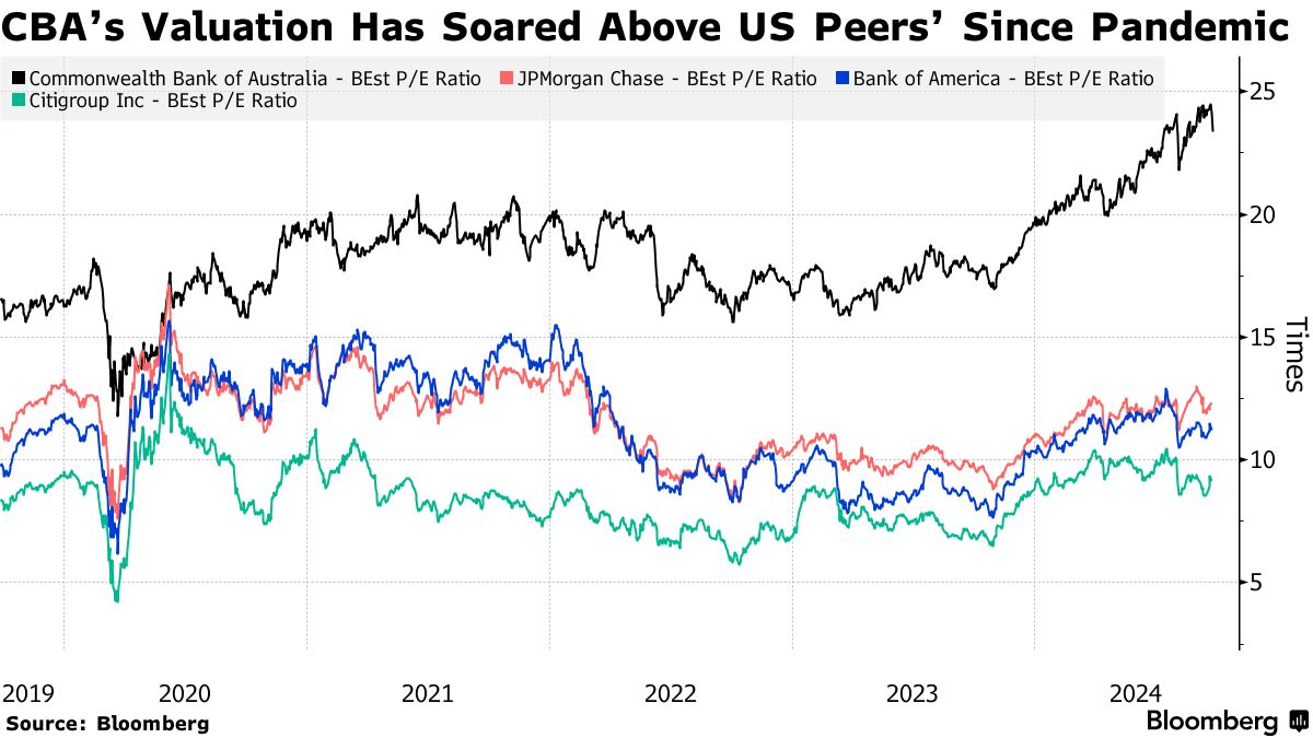 由于盈利疲软与股价飙升同时发生,CBA的估值已超过所有主要全球同行。该澳大利亚贷款机构的股票交易价格为预期利润的23倍,是花旗和美国银行水平的两倍多。