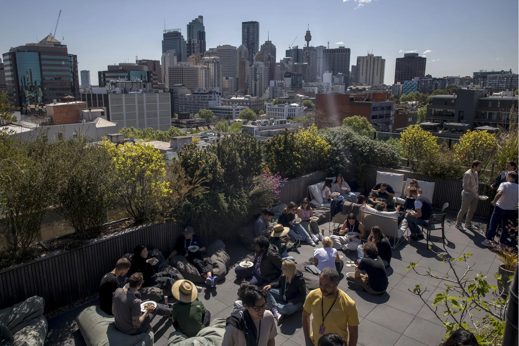 员工们在2024年9月17日于澳大利亚悉尼的Canva总部聚集用餐。摄影师:布伦特·刘因然而,公司也知道,如果想要避免其他未能腾飞的科技独角兽的命运,就需要不断创新。