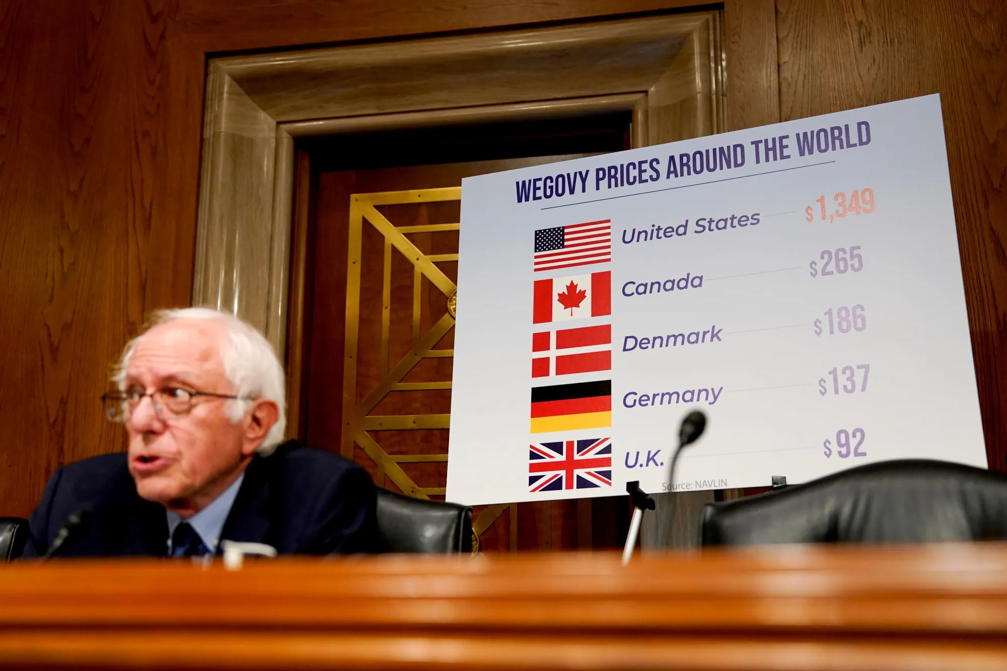 在桑德斯身后有一张海报,显示Wegovy的月剂量在英国的价格为92美元,在德国为137美元,在丹麦为186美元,在加拿大为265美元,而在美国为1,349美元。