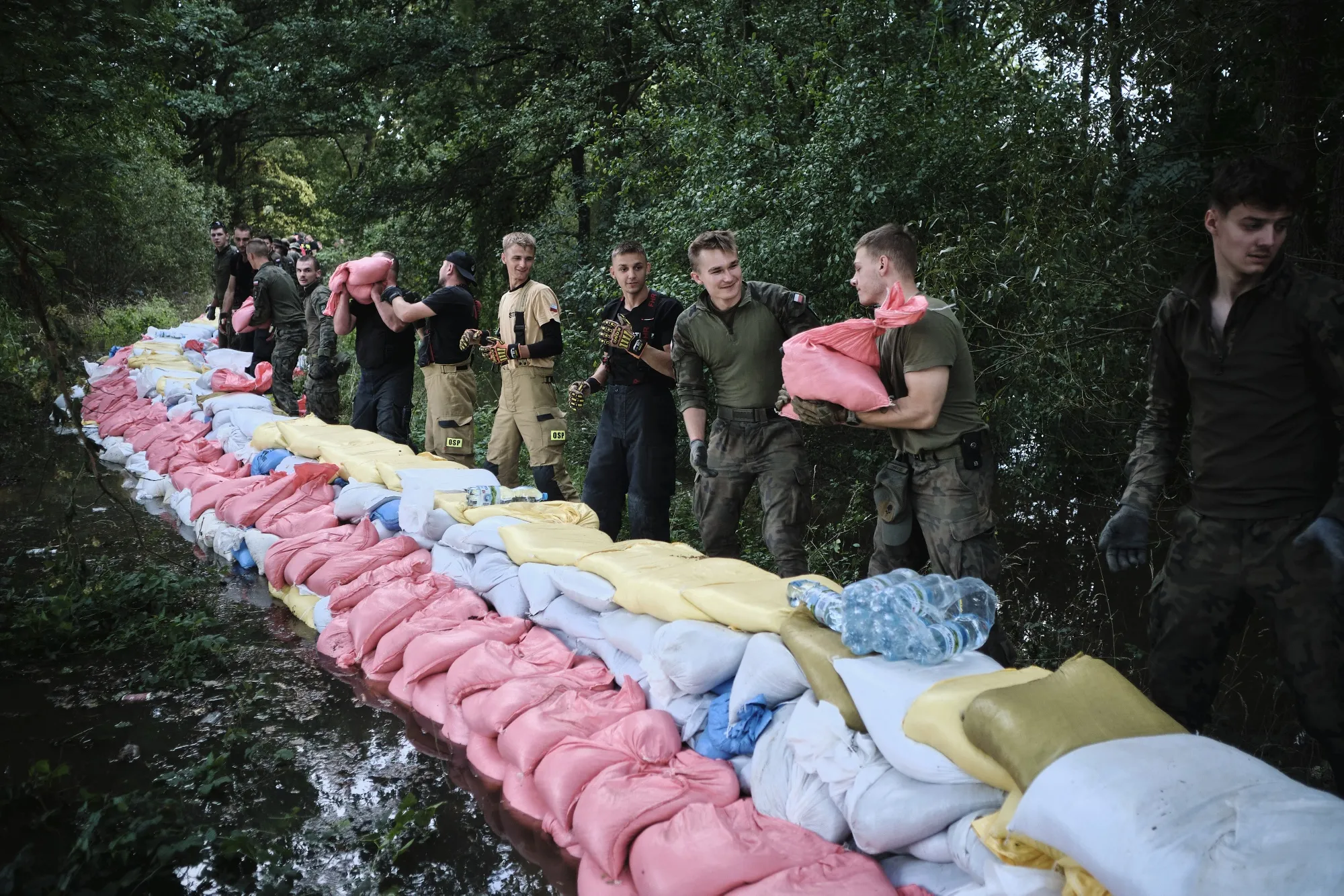波兰西南部罗姆诺夫村的波兰士兵正在用沙袋建造防洪设施。摄影师:Bartek Sadowski/Bloomberg### 值得一听