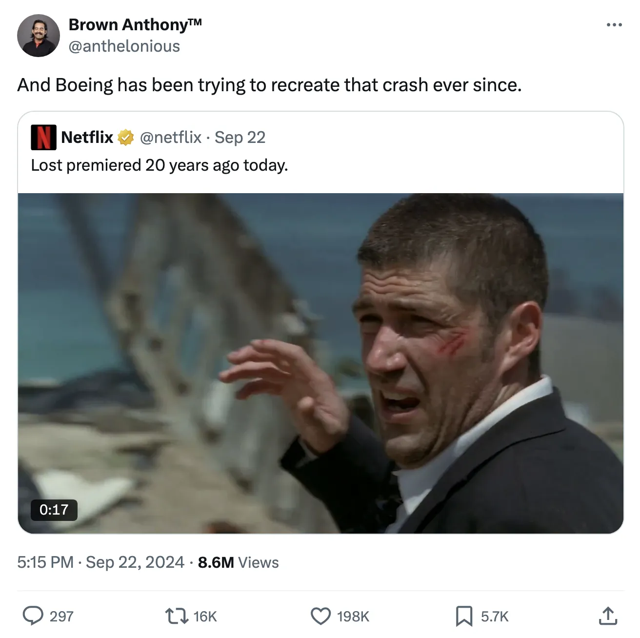 好吧,也许模仿 失落 20年有点牵强。但自从2018年和2019年发生的一对坠毁事件导致300多人遇难以来,这家航空巨头就一直麻烦不断。仅在过去一年中,一 个门塞在飞行中脱落,一对 宇航员被困在太空中, 机舱压力问题导致乘客鼻子和耳朵出血。联邦航空管理局的六周审计显示,波音工厂工人被迫 优先考虑速度而非质量 — 这是任何常旅客都不想听到的发现。