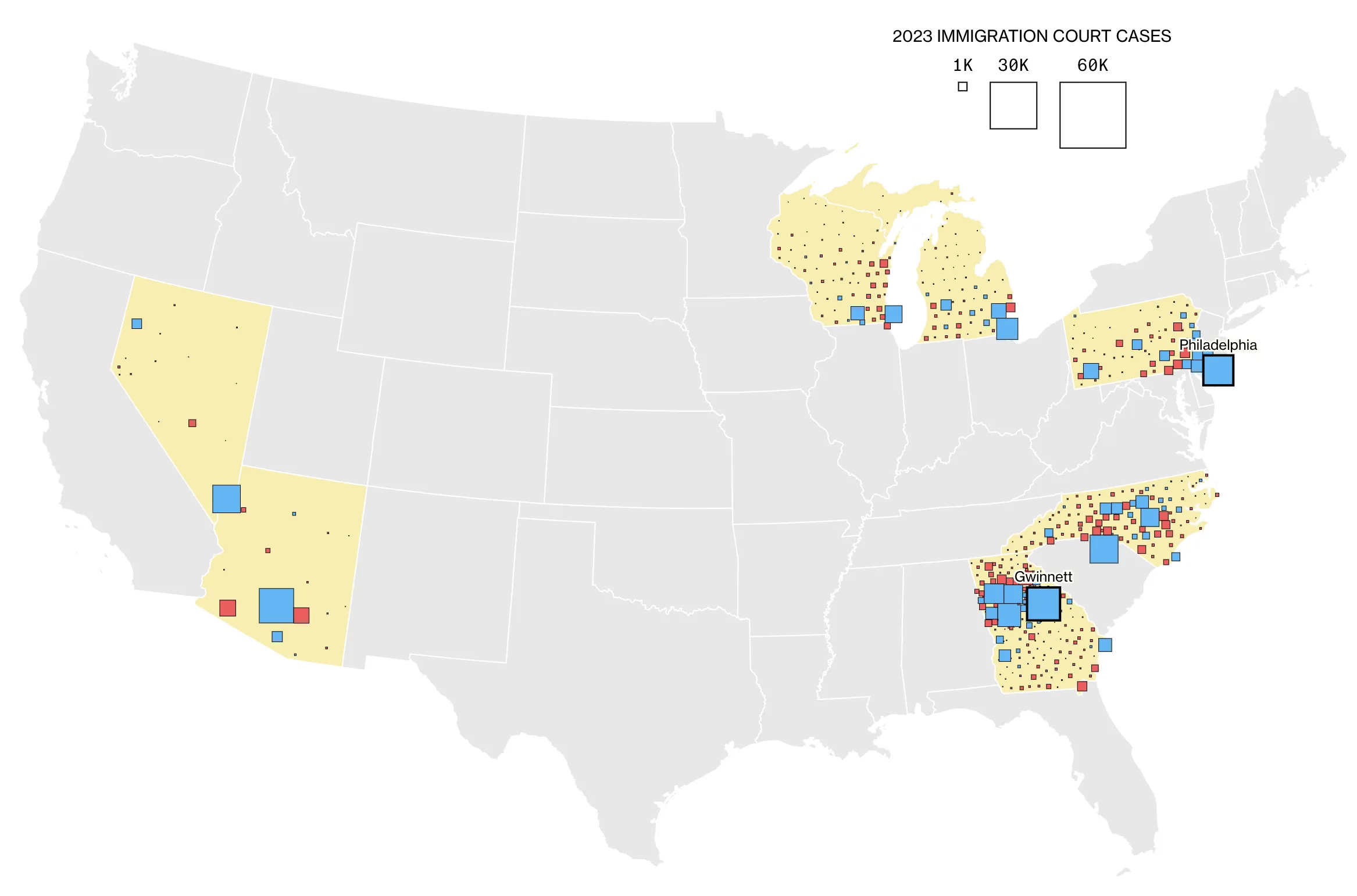 该数据集全面展示了2023年在边境自首的移民的180万待决法庭案件,包括他们计划定居的地址。利用这些地址数据,我们查看了去年在美国每个县定居的移民数量,并使用2020年选举的投票差距数据来了解有多少移民前往倾向于民主党或共和党的县。
