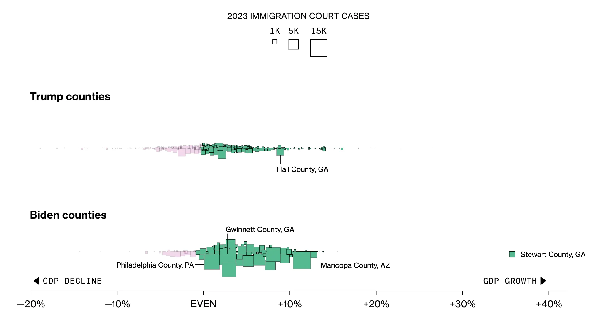 相比之下,85%的移民在摇摆州定居,选择了在2019年至2022年间GDP增长的县。我们通过将2023年与摇摆州县相关的移民地址可视化为不同大小的方块来绘制这一点,然后根据这些方块在2019年至2022年间的GDP变化进行绘图。GDP增长为负的县几乎没有接收移民,而这些县中绝大多数——88%——在2020年被特朗普赢得。