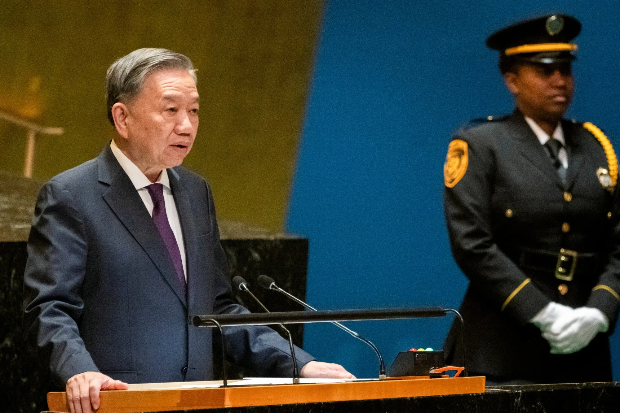 越南共产党总书记托·拉姆在2024年9月24日星期二于美国纽约举行的联合国大会上发言。来自190多个国家的世界领导人齐聚纽约市,参加大会的年度高级别辩论,以及关于加沙战争、俄罗斯入侵乌克兰以及从气候变化到人工智能挑战等问题的讨论。摄影师:Jeenah Moon/Bloomberg总统乔·拜登在与越南共产党总书记托·拉姆会晤时庆祝与越南的“新关系时代”,这是美国努力抵制中国在亚洲的经济和安全影响的一部分。