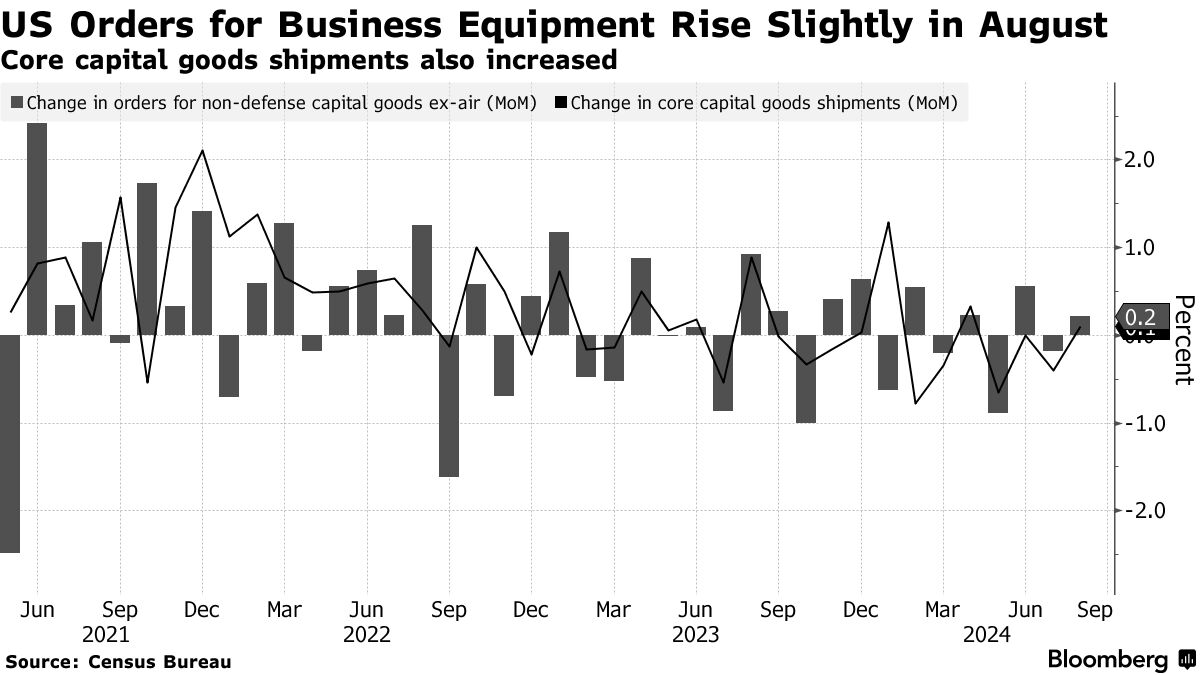 美国工厂的商业设备订单在八月份仅小幅上升,这表明公司在选举前和借贷成本进一步下降之前正在限制投资。
