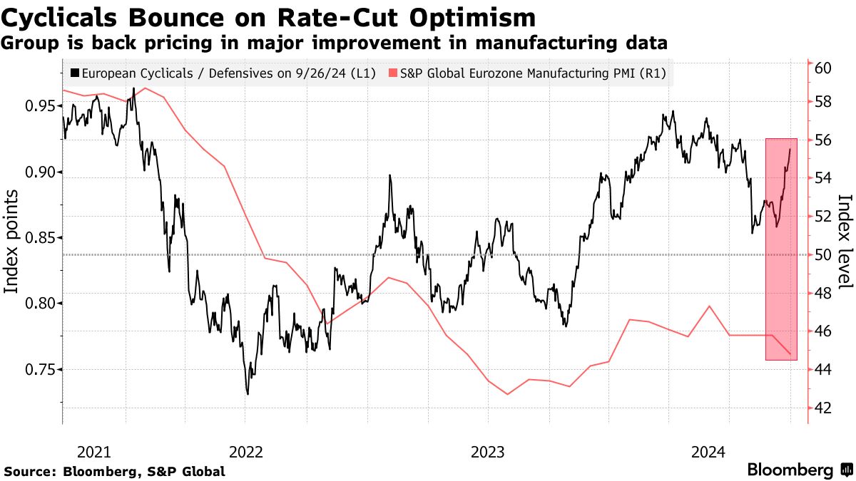 尽管本周的反弹,欧洲股票的交易价格与8月份的收盘价基本持平,原因是对美国和欧洲经济动能放缓的担忧。虽然美联储的降息和中国的刺激措施推动了周期性行业的增长,但投资者仍在寻找新的催化剂。