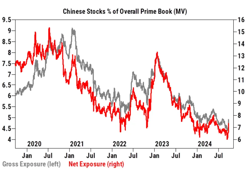 以对冲基金为例。在最近的涨幅之前,他们将不到7%的资本配置到中国股票,约为五年来的最低水平。事实上,自2023年初以来,中国股票在累计名义上仍然被对冲基金显著净卖出。