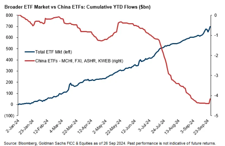 高盛全球主要服务团队来源:高盛全球主要服务团队共同基金也有更多的买入空间。截至8月底,他们在全球对中国股票的配置为5.1%,这是历史低位,Rubner写道。但更大的推动可能来自被动投资者。在2024年6950亿美元的流入中,只有49亿美元流入了中国ETF。