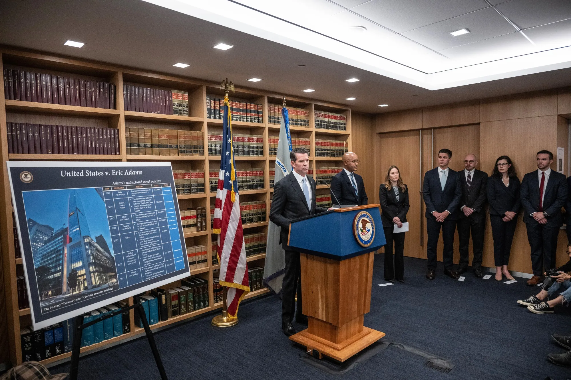 詹姆斯·丹尼希,负责联邦调查局纽约办公室的助理主任,在新闻发布会上发言,宣布对纽约市市长埃里克·亚当斯的贿赂和欺诈指控进行起诉。摄影师:维克托·J·布鲁/彭博社### 你明天需要知道的事情