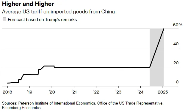 撇开假设不谈,两个国家都无法从另一个长期贸易战中获益。彭博社经济学家汤姆·奥利克表示,60%的全面关税可能会 几乎完全扼杀中国对美国的出口,而对美国向中国的货物征收类似的关税将使美国的销售降至零——每年损失约1500亿美元。