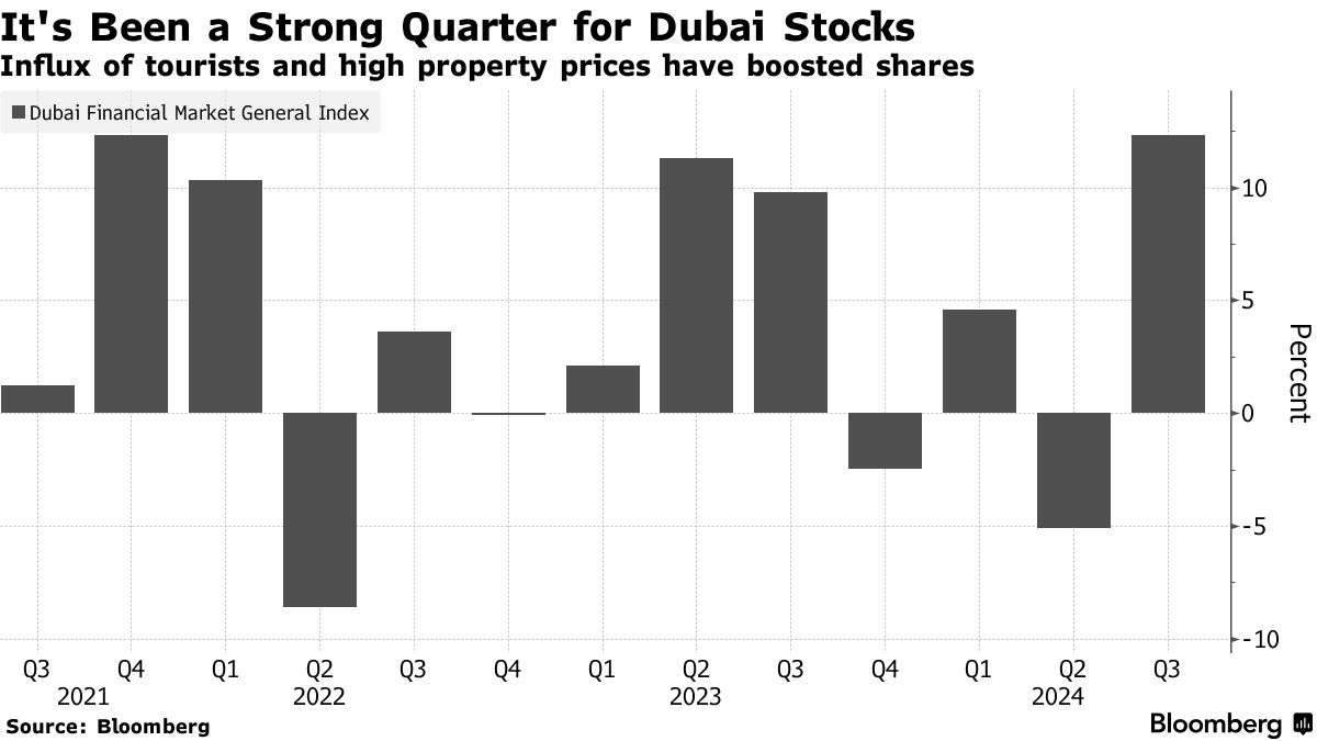 迪拜金融市场综合指数本季度上涨了12%,达到自2014年以来的最高点。其涨幅在彭博社追踪的90多个全球股票基准中名列前十。