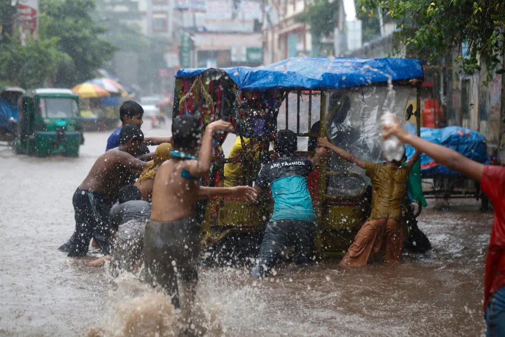 男孩们在2024年9月26日孟加拉国达卡的雨天中拉着人力车穿过被水淹没的街道。到2050年,这座城市可能会接纳多达310万来自孟加拉国其他地区的气候移民。