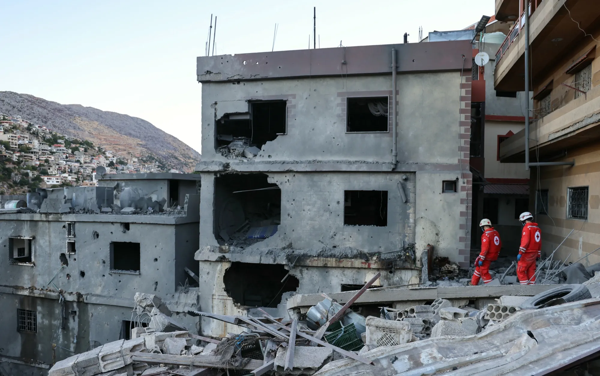救援人员检查以色列空袭后造成的破坏,空袭发生在2024年9月27日,地点是南黎巴嫩的谢巴村,靠近两国边界。